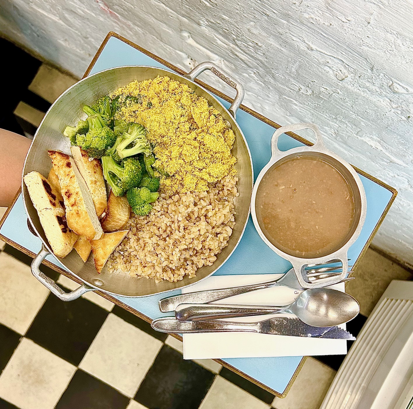 / arroz integral, feijão carioca orgânico, Tofu grelhado , farofa e brócolis no vapor