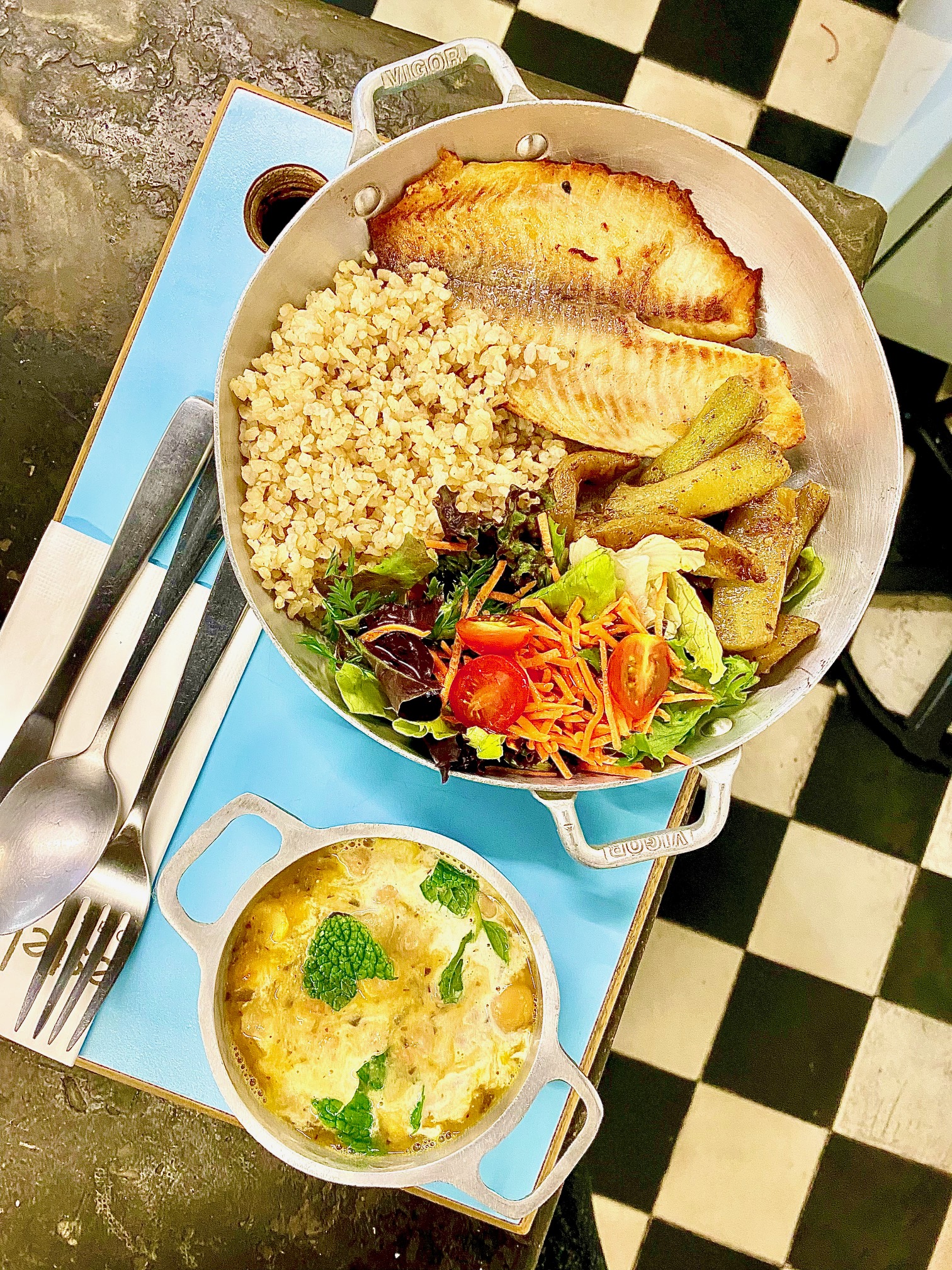 arroz integral, grão de bico com tahine, tilápia sem hormônio grelhada, chuchu assado com alho e cominho acompanha uma mini saladinha de folhas e tomatinho cereja