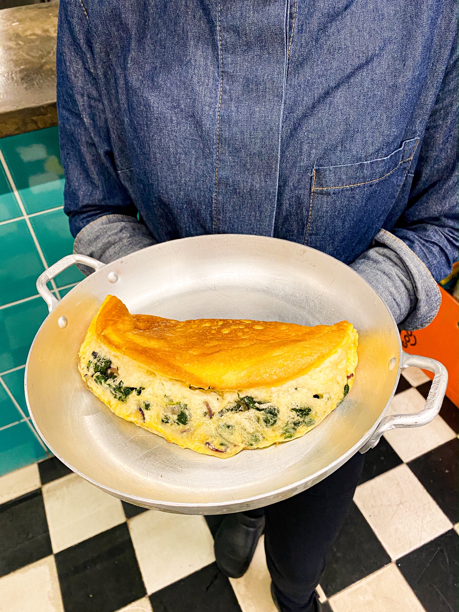 Omeletão suflê feito de ovos livres de gaiola, sem hormônio, de parmesão com espinafre e cebola roxa com mix de folhas verdes, tomatinho, cenoura ralada e granola salgada