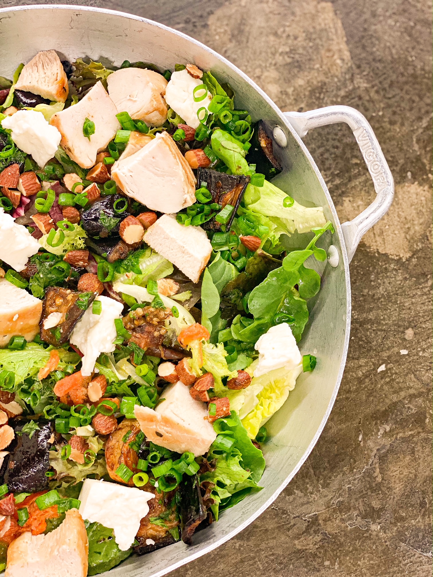 Saladona de berinjela com frango: mix de folhas verdes, frango Korin grelhado em cubos, berinjela assada no alho, queijo de cabra, amêndoa defumada, cebolinha e molho de cenora com gengibre